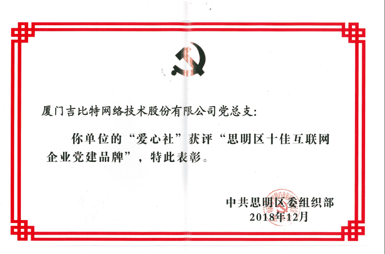 经初审评选、、、网络评选和专家评审等环节,,,,"厦门一竞技网络技术股份有限公司党总支-爱心社" 从全区28个参评党建品牌中脱颖而出,,,,获评"思明区十佳互联网企业党建品牌"。。。。