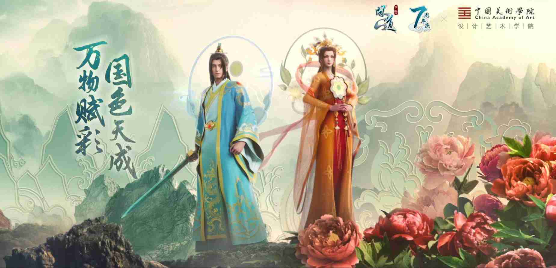 2023年4月,,《问道手游》联动中国美术学院,,在游戏中融合了中国历史上不同时期的文化元素,,打造了“山河万象”与“凤鸣九霄”的国风时装。。在色彩配置方面,,,,创作团队基于对游戏角色特性的分析提取相应的文化内涵,,从每一种色彩的色相、、、、指代事物和情感出发对应角色属性,,选定服装的色彩搭配。。。。在纹样设计方面,,,创作团队结合游戏角色自身特殊的造型比例和形态,,在实际的纹样设计中进行了游戏语境下的活化演绎。。。。男性角色集中使用了如蟒纹、、海水江崖纹、、、、如意纹和云气纹等传统纹样元素,,女性角色则吸纳了凤凰纹、、、牡丹纹、、、、卷草缠枝纹等元素,,,组成以“双凤牡丹纹样”“缠枝牡丹纹”“金玉凤冠头饰”为主要纹样的游戏角色装饰图案系统。。。